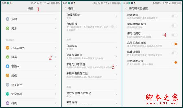 机友们应该知道爱疯有个来电闪光功能,小伙伴别急,MIUI6也给大家带来了此功能,按图所示进入设置后,选择电话,找到来电时状态设置,进入来电闪光灯开启开关就可以使用。当有电话来时,闪光灯会立马闪烁,不要太亮瞎眼哦,是不是很逼格。