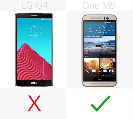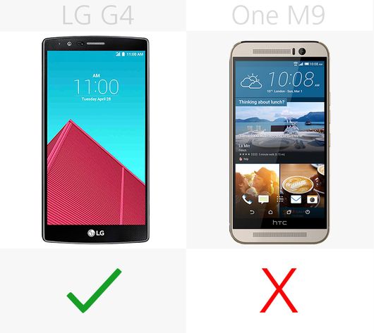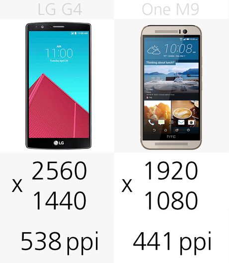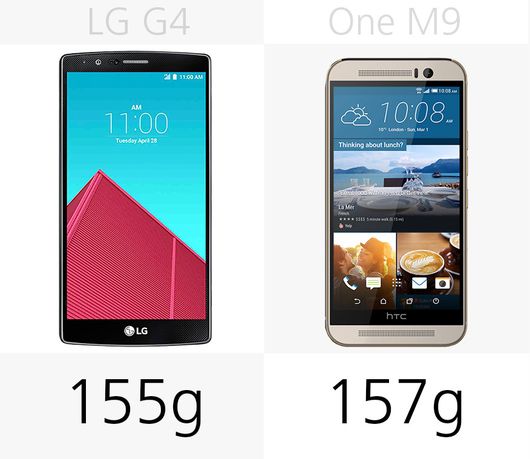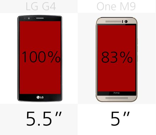 LG G4的屏幕尺寸要比HTC One M9大21%。考量到机身尺寸大了一点重量更轻,G4在屏占比更高一点。
