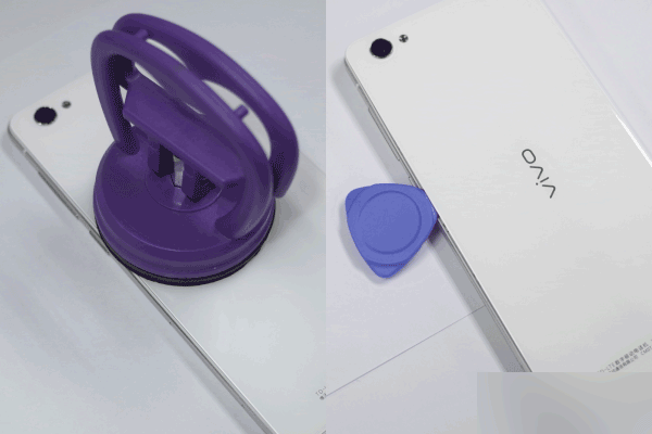 2,电池盖加热后,采用吸盘和拆机片(前面提到的卡类工具)将电池盖与下盖分离。