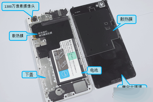vivo X5Pro电池固定方式比较新颖,不同于以往的双面胶或易拉胶固定,容易拆卸同时电池表面丝印了图文拆卸步骤,非常人性化的设计。