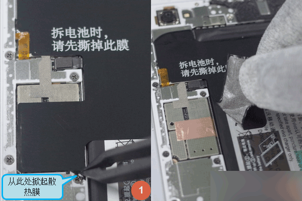 非常严肃地提示:这里最好用塑胶镊子去掀开散热膜。如果你说只有金属镊子,那好吧,尽量避开戳到电池位置,否则你的电池就要冒烟啦。。。