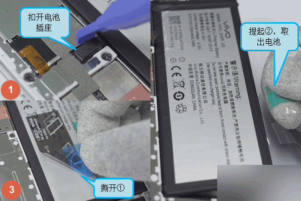 2.2抠开电池插座,接着按电池表面的拆卸提示将1撕开,再提起2拉手取下电池。