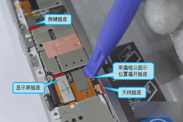 1.根据图中红线位置,用工具或是指甲抠开插座和天线插头。