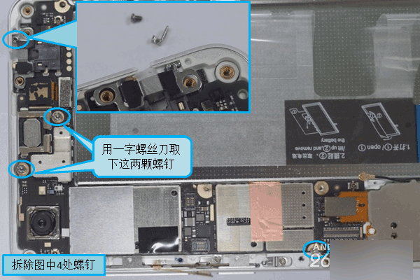 2. vivo X5Pro的主板有四颗螺钉固定,其中耳机插座支架处有一个很小的螺钉,固定一个小金属扣;