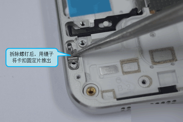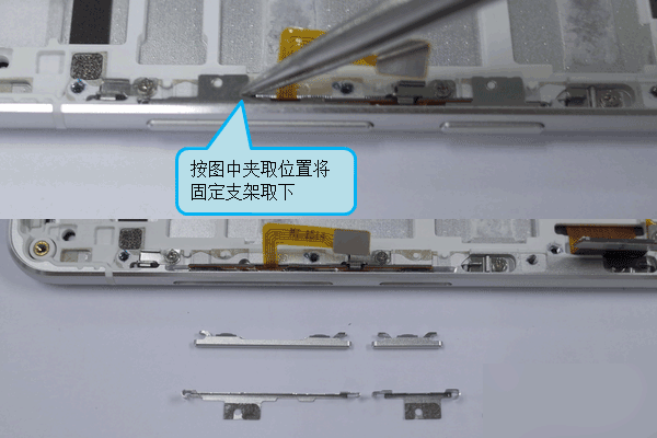 1.用镊子将侧键固定支架取下,取出键帽。
