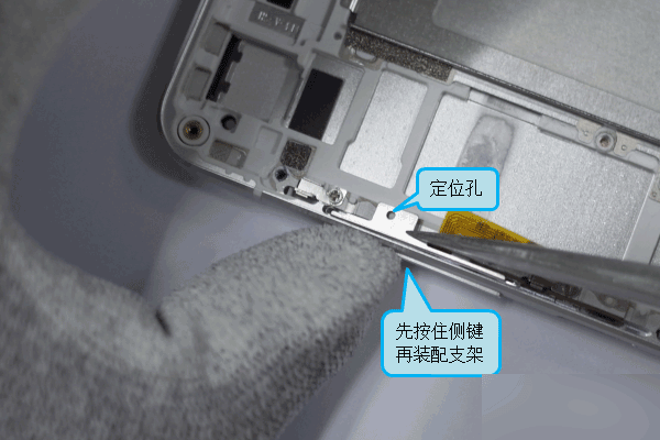 1.将侧键先装入上盖侧键孔,如图按住侧键再装配固定支架,支架定位孔与上盖定位柱相对应,支架装好后按压确认是否有弹性。