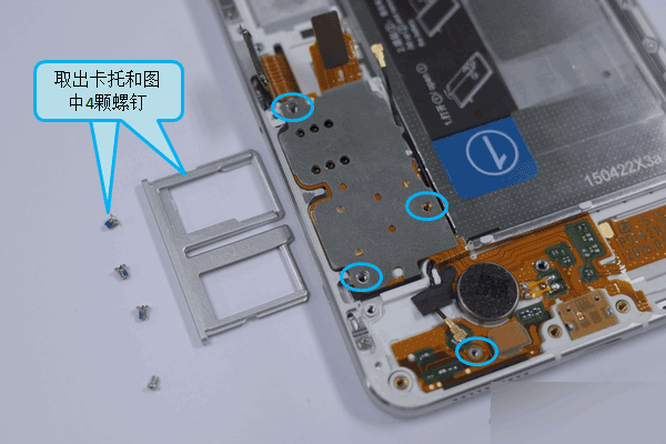 1. 用取卡针取出卡托,再将卡座上的3颗螺钉和FPC上的1颗钉取下
