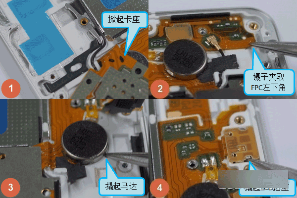 ①.掀起卡座; ②.镊子夹取FPC左下角;