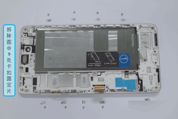 1、将手机两侧边9处卡扣螺钉拆除,将固定片如图方式推出