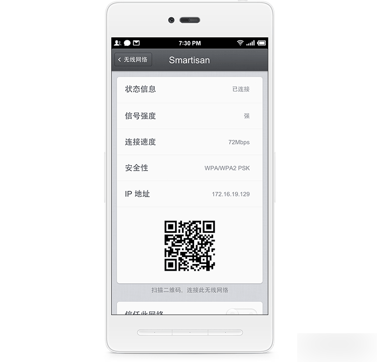 新增:在“设置 - 无线网络”中选择已连接的无线网络热点,可以将这个无线网络以二维码形式分享。Smartisan T1 手机使用相机内置的二维码功能可以连接到相应的无线网络