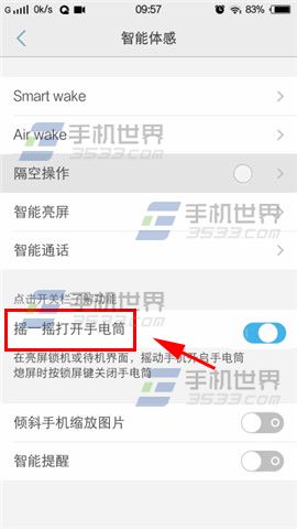 打开X5Max手机【设置】,点击【智能体感】,将【摇一摇打开手电筒】开启即可。(如下图)