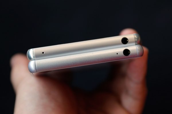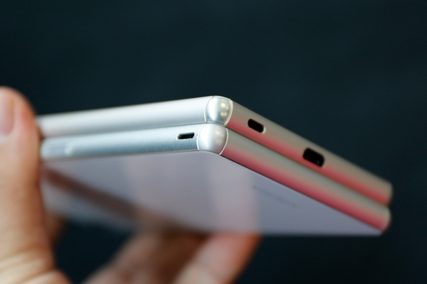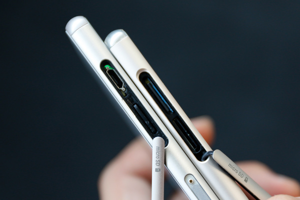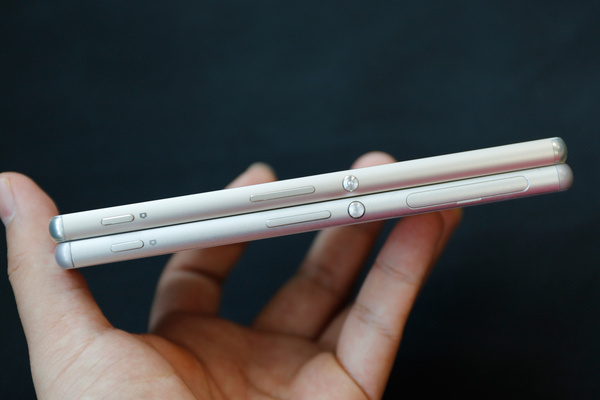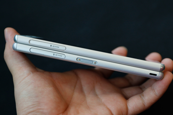 外形上来看,Xperia Z3+机身厚度为6.9mm,重144克, 相对Xperia Z3厚度降低0.4mm,电池容量也缩减为2930毫安时。 Xperia Z3+将前置镜头的位置更改至左边,引入隐藏式双扬声器设计,同时SIM卡也被移至SD卡处并使用二合一卡槽,micro USB接口被安置在机身底部,取消了磁吸充电接口,但Xperia Z3+依旧为IP68防水性能。