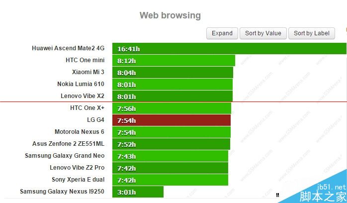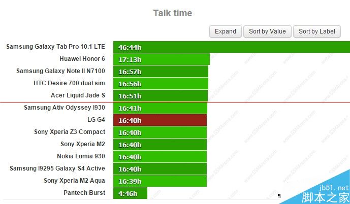 在3G网络下,G4的成绩为16小时40分钟,远低于G3的25小时,甚至比搭载骁龙810的LG G Flex 2表现还差,后者还能到18小时呢。另外,搭载骁龙810处理器的HTC M9更是能达到21小时,对比之下G4的表现非常差劲。