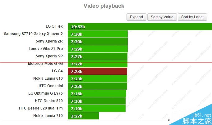 G4的视频播放成绩为7小时23分钟,和G3表现差不多。在表格中,表现与之类似的都是一些电池容量较小的中低端产品。