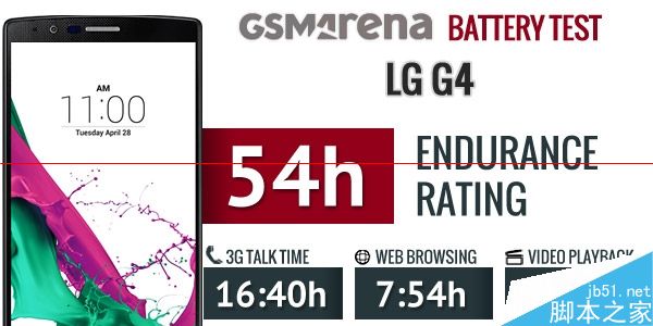 在屏幕亮度为50%的情况下,LG G4的网页浏览时间为7小时54分钟,强于G3,和Nexus 6差不多。