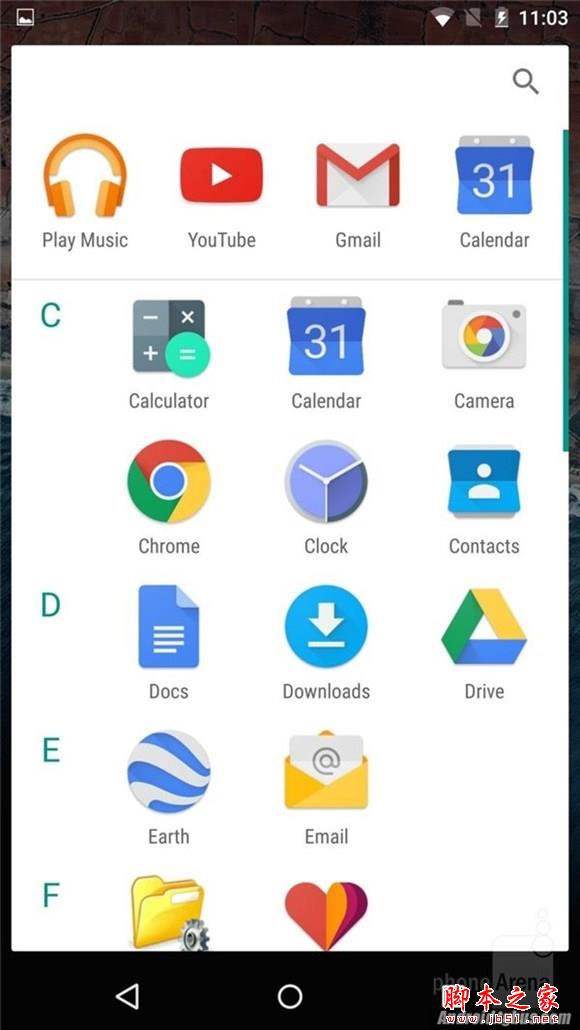 ▲应用程序抽屉的改变巨大,它现在变成了垂直滑动而不是横向滑动,左侧还增加了硕大的分类字母提示,顶部还提供了一个喜欢的应用面板,不过在现有的版本中,以上四个程序是由系统自动设置的,用户无法手动选择。点击右上方的放大镜按钮,可以方便的进行应用程序搜索。