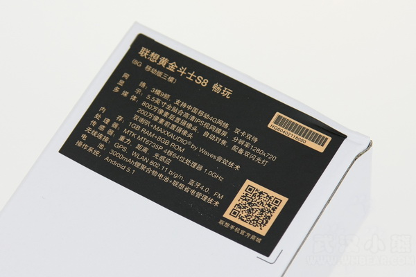 黄金斗士S8畅玩版的包装依然还是延续了联想黄金都是系列产品简洁、环保的纸盒包装,不过和之前的S8 4G版不同的是采用了白色的包装盒。包装盒大小和手机本身的大小很接近,背面则是用黑色的帖纸标注了产品的型号以及关于配置的一些信息。