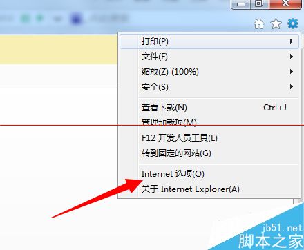 2、在弹出的菜单栏中选择【Internet选项】选项