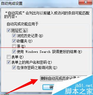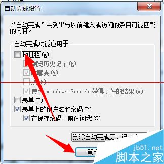 7、然后返回自动完成界面,将【地址栏】选项前方勾取消,然后点击确定