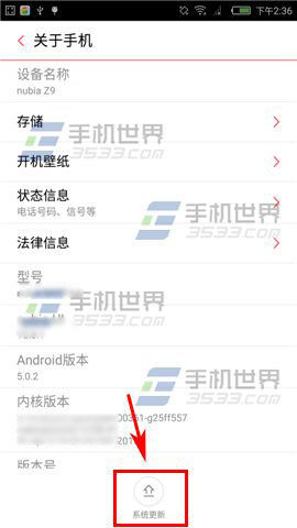 1)打开努比亚Z9【设置】界面,点击【关于手机】,点击【系统更新】;(如下图)