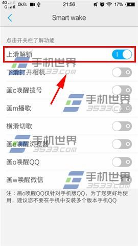 2)将【上滑解锁】开启,在熄屏状态下,上划即可解锁。(如下图)