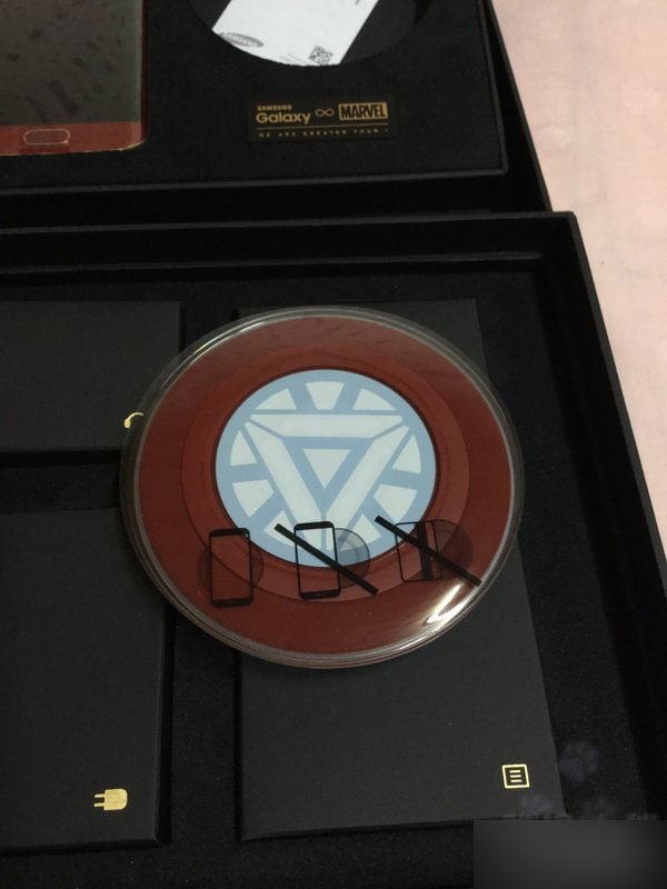 当打开完全打开包装盒之后,传说中钢铁侠限量版出现在眼前,与其同时出现还有耳机,充电器,说明书以及一个无线充电器(该无线充电器的外形是按照钢铁侠胸前的能量块形状所设计)。