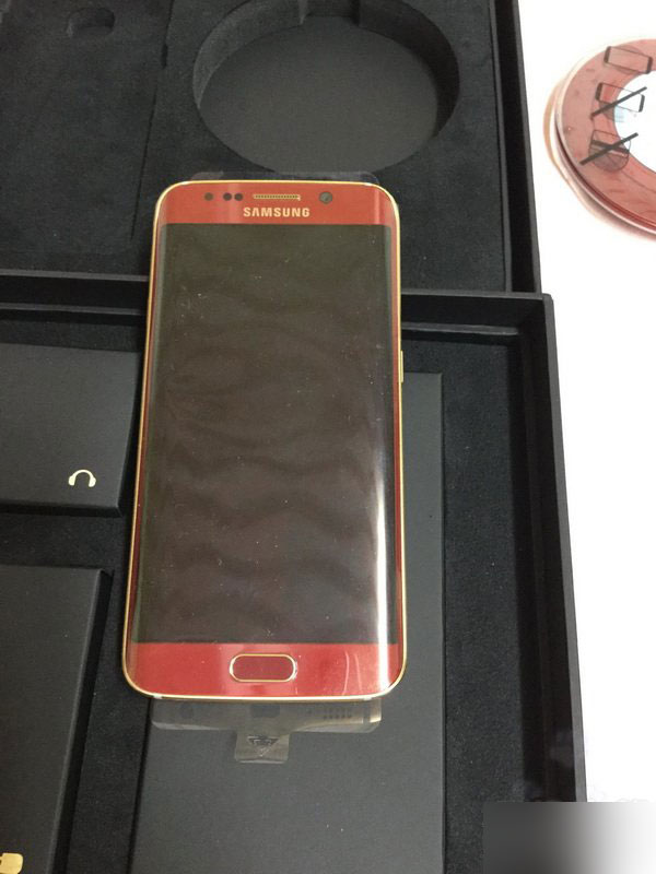 接下来便是今天的主角——GALAXY S6 edge 钢铁侠全球限量版手机。该机外形上与标准版的GALAXY S6 edge一样,但是其拥有的是钢铁侠独特的红色配色,而且该机边框以及三星标志侧为黄色配色。