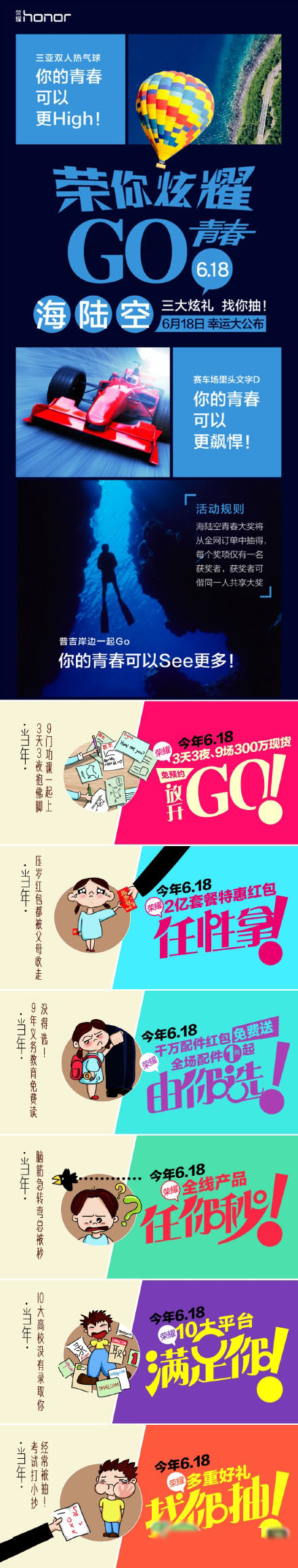 荣耀618全网促销将于6月16日凌晨正式开启!荣耀将于6.16日至18日,推出3天9场开放购买,包括荣耀6Plus、畅玩4X、荣耀4C、荣耀6等,共计300万现货产品。荣耀6、荣耀6Plus双4G版直降200元回馈消费者,同时荣耀还将推出2亿套餐红包,所有人皆有机会领取,另外还有全场配件1元起,更有海陆空360°极限青春大奖!具体活动有哪些,一起来看看!