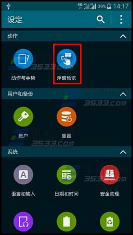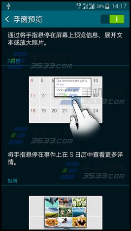 1)打开三星S6Edge的【设定】,点击【浮窗预览】,打开该功能;(如下图)