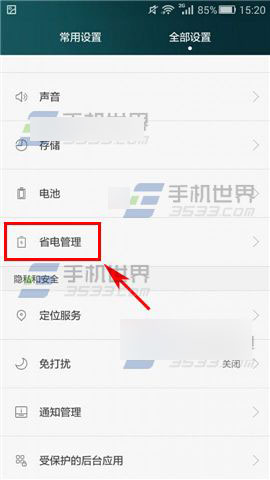 1)进入华为P8青春版的【设置】,在【全部设置】栏选择【省电管理】;(如下图)