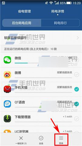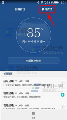 2)点击右上角【耗电详情】,然后点击右下角【菜单】;(如下图)