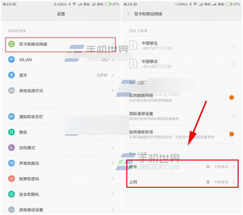1)打开小米Note顶配版的【设置】,选择【双卡和移动网络】,点击【拨号】(默认上网卡设置同理);(如下图)
