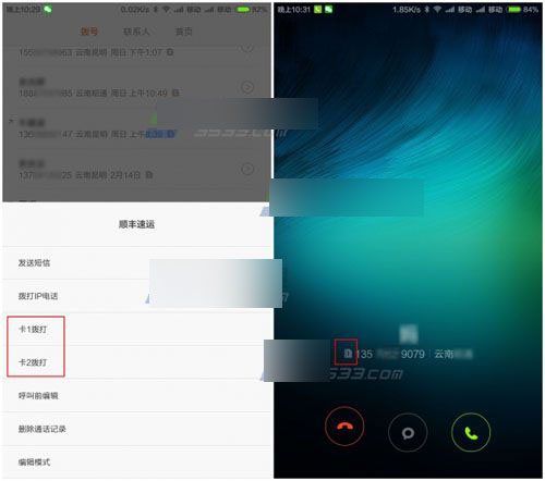3)上面小编将卡2设置成了默认号,正常拨打的情况下是直接用卡2拨打的,如果需要用卡1,长按要拨打的电话,然后选择【卡1拨打】即可。(如下图)