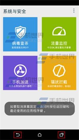 3)点击【多任务】按钮,将要固定的应用置于第一位置,推动后点击【图钉】按钮,即可实现屏幕固定功能。PS:开启该功能后,在【该软件】中只有【返回键】可以使用,且不能退出该软件。若要退出屏幕固定请同时按【返回键】+【多任务】。(如下图)