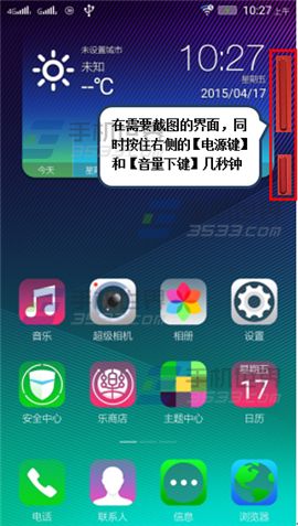 1)在任意界面中同时按住【电源健】跟【音量下键】即可截屏。(如下图)