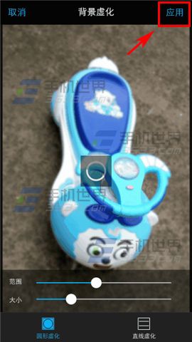 2)我们可以选择圆形或直线虚化,调整范围及大小,点击【应用】即可看到效果,最后不要忘了【保存】哦。(如下图)
