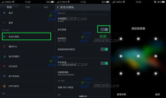 进入OPPO R7【设置】界面,在【常规】栏目中,点击【安全与隐私】,将【显示图案】关闭即可。(如下图)