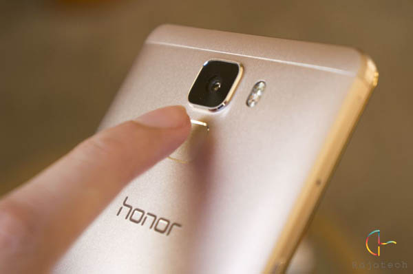在背面可以看到,荣耀7采用了和Mate 7一致的三段式设计,上下部分为塑料材质,让信号能顺利输出,中间则为大面积的金属磨砂后盖,质感颇为不错。顶部为2000万像素摄像头,稍微凸出于表面,而右侧为双色温闪光灯,下面则为“指纹识别2.0”。之所以称之为指纹识别2.0,是因为其不单单是拥有更快的黑屏开启识别速度,同时它还支持通过上下滑动、长按、短按等方式来实现拍照、通知栏下拉、接电话等功能,毕竟背后控制也算是一个比较顺手的方式,这种改变还是很实用的,特别是自拍时长按指纹识别键快速自拍,非常好用。它也支持支付宝、微信和百度支付,功能更加实用。