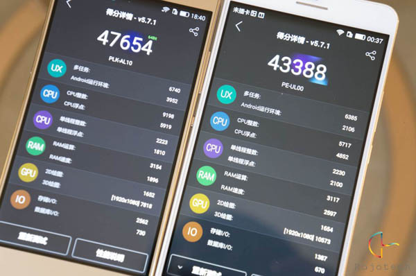 这次荣耀7采用了P8同款麒麟935处理器,相比荣耀6 Plus的麒麟925,主要是架构上不同(4*增强A53+4*A53)以及主频(2.2Ghz),同时增加了协处理器记录运动数据。在这次简单的性能对比中,同样采用1080P屏幕和3GB RAM,在安兔兔上,荣耀7获得了47000分,而荣耀6 Plus是43000分,提升了4000分,可见它的性能有了一定提升,依旧处于目前处理器的中高水平,相比高通骁龙810和三星Exynos 7420等还是有不少差距的。