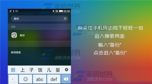 1)在华为荣耀7等机界面中下划进入【搜索界面】,输入【备份】,点击并打开搜索结果里的备份。(如下图)