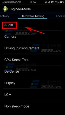 1)在OPPO R7拨号界面输入【*#800#】在【Hardware Testing】栏中点击【Audio】。(如下图)