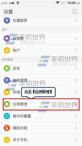 2)将存储位置修改成【SD卡】重启手机,进入【设置】点击【应用管理】。(如下图)