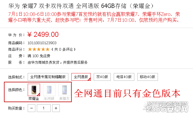 其他几个版本有冰河银和高雅灰两种颜色,而全网通版本只有荣耀金这一种颜色!