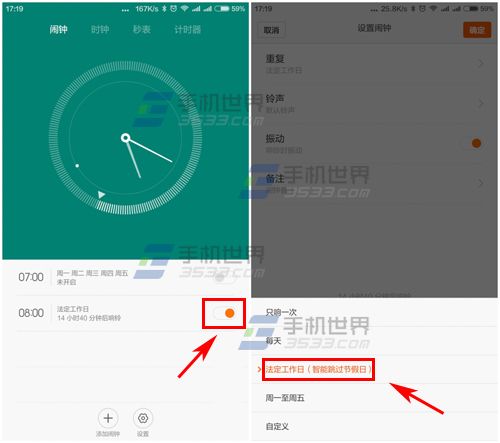 打开小米Note【闹钟】,开启该闹钟并进入【设置闹钟】界面,点击【重复】选择【法定工作日】即可。(如下图)