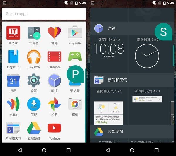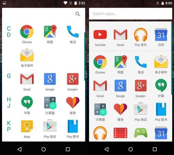 此前的开发者预览版将应用抽屉里面加入了首字母分类,有点类似WP的应用排列逻辑。但是整体割裂感十分严重,虽然方便查找应用,但是整体美观性大打折扣,而最新版本改善了这一问题,取消了前面的字母排列,图标更加规整简洁,当然了,谷歌并没有放弃字母排列逻辑,用户只需在界面右侧滑动,字母就会浮出来方便查找。
