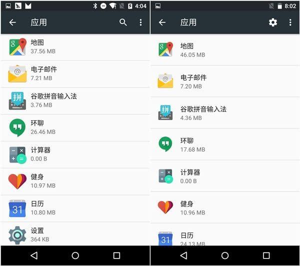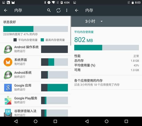 在之前的安卓所有版本里,内存占用都是要进入设置,再进入应用后进行查看的,而上一版预览版的内存则在应用选项中更加隐蔽,不利于管理和查看。这次谷歌干脆将内存移动到设置选项里,让用户直观地查找和管理。另外设置里的界面也更加简洁清晰,我们也可以根据需要查看各个时段的内存状况,不过上一版中的内存状态提示却消失了,略显遗憾。