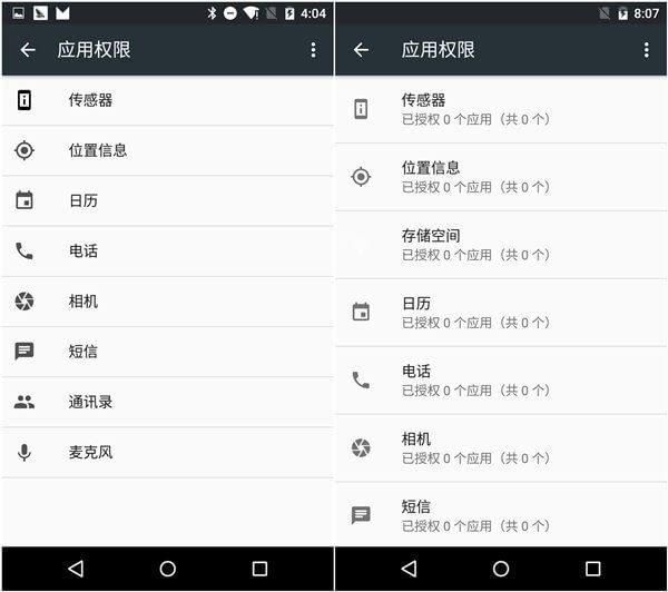 这次谷歌也在应用中将权限设置单独列出来,替代了右上方的搜索符号。这么一个小小改动,就能让操作变得简洁明了,是一个非常聪明的改动。这次谷歌在权限管理中不仅增加了储存空间的权限管理,还增加了权限配置的直观性,用户不需点击就可以看到权限配置情况。可见在不久的将来,谷歌将会交给用户越来越多权限管理的权力。