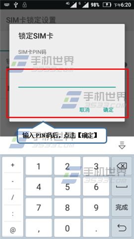 2)开启【锁定SIM卡】功能,输入SIM卡PIN码后点击【确定】。PS:如不知道自己的PIN码,请跟运营商获取,切勿胡乱输入,PIN码输入次数太多会导致手机卡锁死!(如下图)