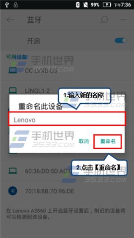 2)点击【菜单键】,选择并点击【重命名此设备】,输入自己喜欢名字便可以了。(如下图)