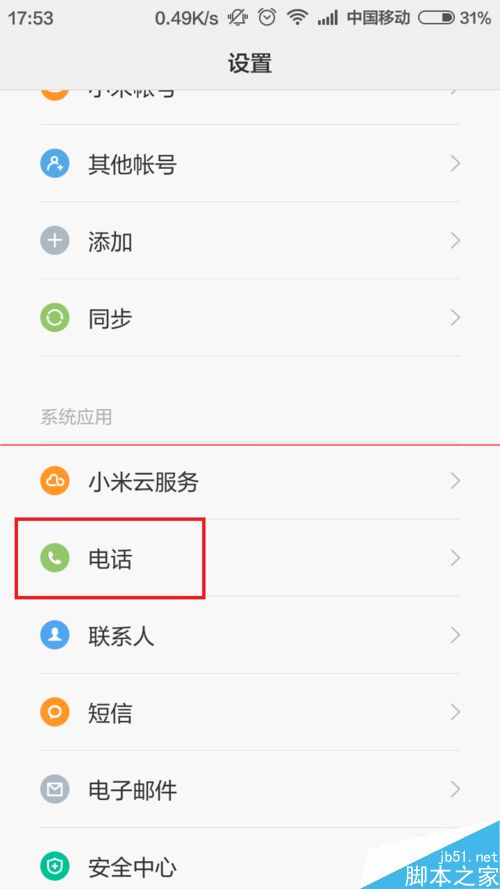 2、进入MIUI6系统应用之后,将页面向下拉,点击选择“电话”选项,进入电话设置选项。